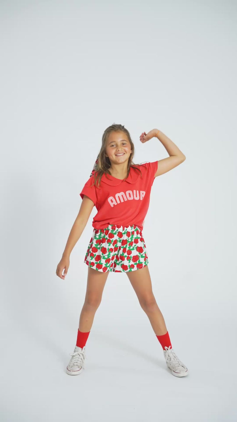 Deze shorts van Piupiuchick combineert een zachte ecru basis met een speelse rode rozenprint voor een romantische, zomerse look. Perfect voor warme dagen, biedt deze short optimaal draagcomfort en bewegingsvrijheid voor actieve kinderen.