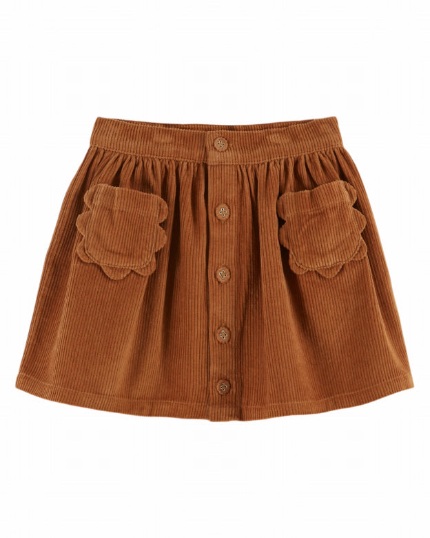 Deze cognackleurige rok van Emile et Ida is een must-have voor elke stijlvolle mini-garderobe! Gemaakt van een heerlijk zachte ribstof (corduroy) combineert dit rokje comfort met een speelse vintage uitstraling. De twee schattige bloemvormige zakken aan de voorkant maken dit item onweerstaanbaar lief en uniek.