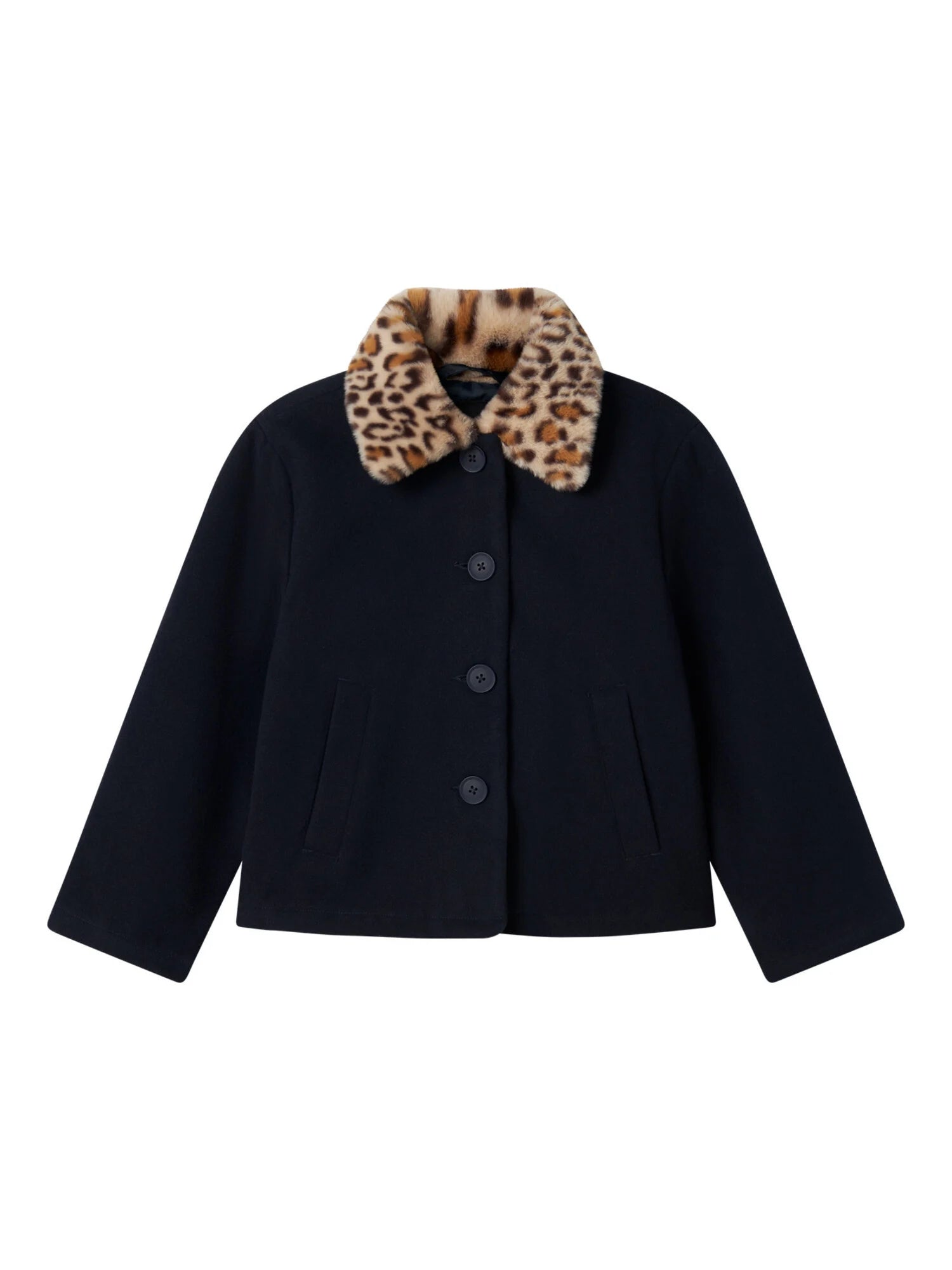 Super toffe nette jas van Name It met speels Leopard kraagje. Het jasje heeft een knoopsluiting, platte kraag en 2 toffe zakken op de voorkant.