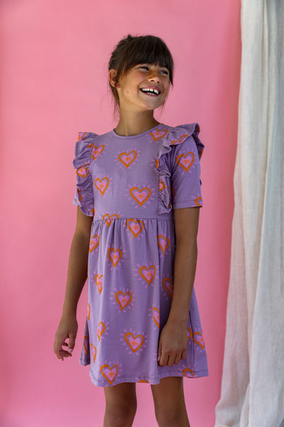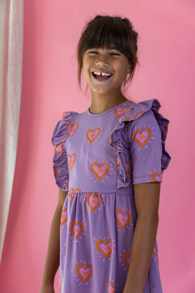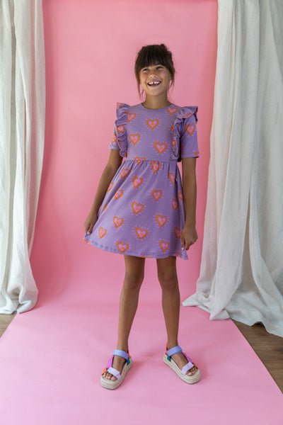 Deze jurk van Ammehoela is speciaal voor de meiden die helemaal weg zijn van de hartjes print. Hier word je toch helemaal vrolijk van. Een mooi detail zijn de ruffels op de schouder dit geeft het jurkje net even meer pit.