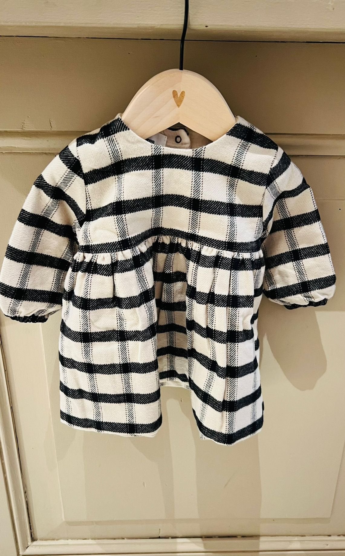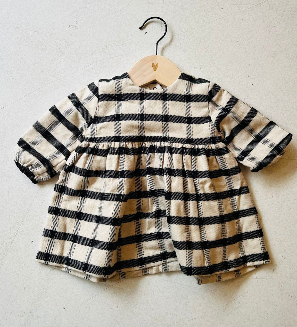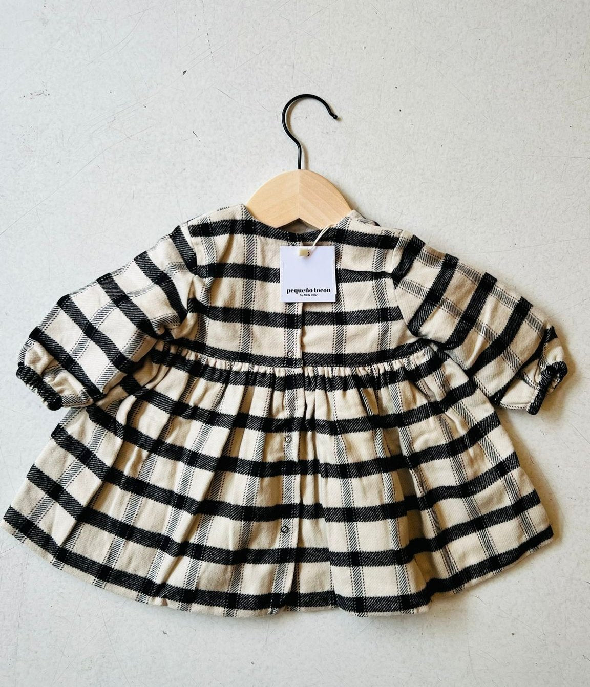 Prachtige zachte jurk van Pequeno tocon met zwart/beige geruit patroon. Heerlijk zacht en warm met drukknopen sluitng op d rug. Gevoerd met katoen.